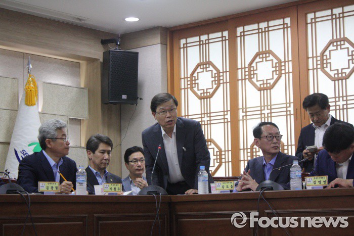 (성주=포커스뉴스) 26일 오전 경북 성주군청을 찾은 황희종 국방부 기조실장이 성주군민들과 간담회에서 질문에 답변하고 있다.
