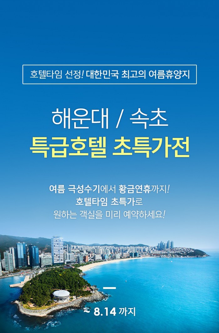 이 기간 '호텔타임'을 이용하면 국내 휴양지로 인기 있는 부산 해운대와 강원 속초 대표 특급호텔 11곳을 최대 80% 할인된 가격에 예약할 수 있다.
