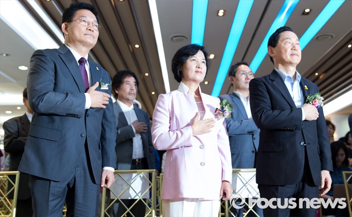 (서울=포커스뉴스) 26일 오후 서울 서초구 엘루체에서 열린 더불어민주당 서울특별시당 서초갑 정기지역대의원대회에서 전당대회 출마를 선언한 송영길(왼쪽부터) 의원과 추미애 의원, 김상곤 의원이 국민의례를 하고 있다.