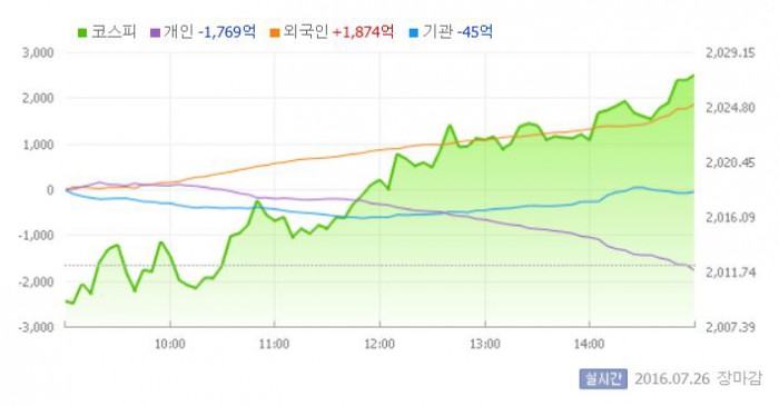 이날 코스피는 전일 대비 0.15% 하락한 2009.40으로 장을 시작했다. 이후 지수는 장 중반 기관의 대규모 매도세에 약세를 보였다. 그러나 장 후반 외국인의 사자 규모가 커지면서 2020선으로 올라섰다. 외국인은 1889억원을 순매수하며 14거래일째 순매수를 이어갔다.