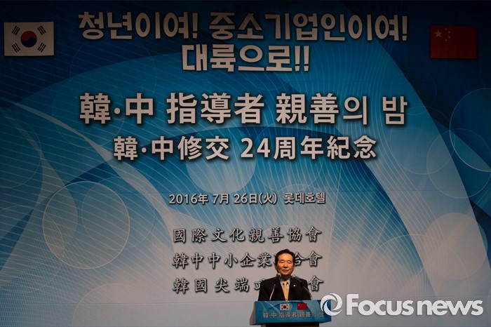 (서울=포커스뉴스) 정세균 국회의장이 26일 오후 서울 중구 롯데호텔에서 열린 '한중 지도자 친선의 밤' 행사에서 참석해 축사를 하고 있다.