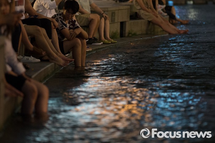 (서울=포커스뉴스) 서울과 전국 대분분 지역이 열대야인 26일 오후 서울 종로구 청계천을 찾은 시민들이 더위를 식히고 있다.