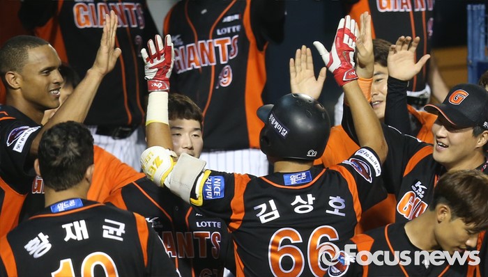(서울=포커스뉴스) 26일 서울 잠실구장에서 열린 2016 프로야구 롯데-LG 경기 8회초 롯데 선두타자 김상호가 좌중월 홈런을 치고 더그아웃에서 동료들과 함께 기뻐하고 있다.