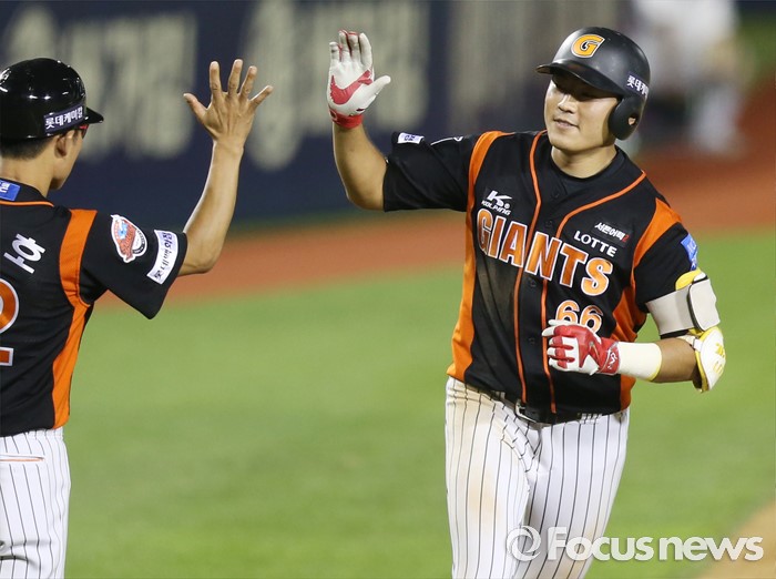 (서울=포커스뉴스) 26일 서울 잠실구장에서 열린 2016 프로야구 롯데-LG 경기 8회초 롯데 선두타자 김상호가 좌중월 홈런을 치고 3루를 돌며 최만호 코치의 환영을 받고 있다.