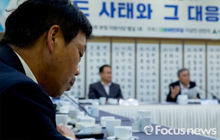 (서울=포커스뉴스) 27일 오전 서울 여의도 국회 귀빈식당에서 야3당 소속 의원들 주최로 열린 사드사태와 그 대응전략 간담회에 참석한 이완영(경북 고령·성주·칠곡군) 새누리당 의원이 이종석 전 통일부 장관의 발언을 듣고 있다.