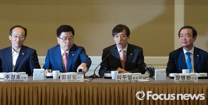 (서울=포커스뉴스) 27일 오전 서울 여의도 국회 귀빈식당에서 열린 경재재정연구포럼 조찬 간담회에 참석한 이주열 한국은행 총재가 발언하고 있다. 왼쪽부터 추경호 새누리당 의원, 김광림 정책위의장, 이주열 한국은행 총재, 장병완 국민의당 의원.