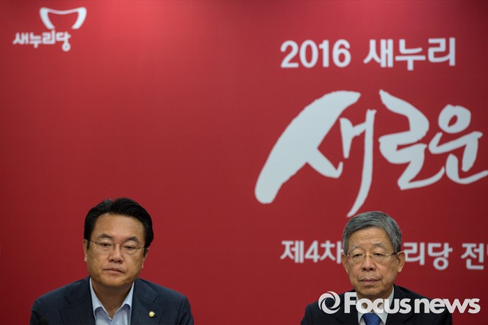 (서울=포커스뉴스) 김희옥(오른쪽) 새누리당 혁신비상대책위원장과 정진석 원내대표가 27일 오전 서울 여의도 새누리당사에서 열린 혁신비상대책위원회의에 참석하고 있다.