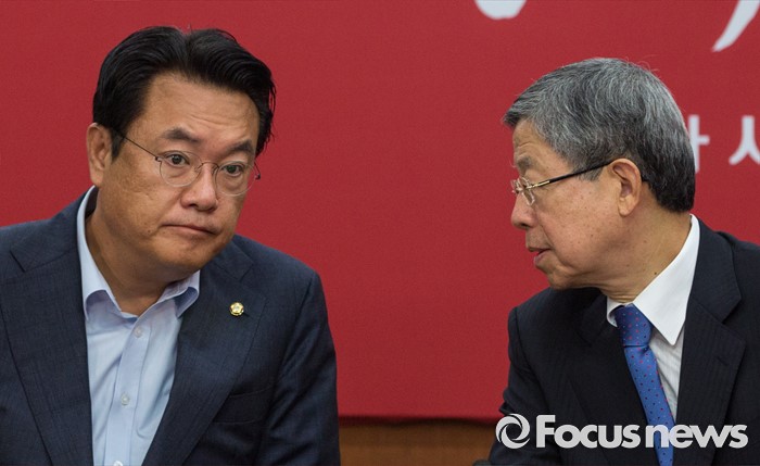 (서울=포커스뉴스) 김희옥(오른쪽) 새누리당 혁신비상대책위원장과 정진석 원내대표가 27일 오전 서울 여의도 새누리당사에서 열린 혁신비상대책위원회의에 참석해 대화 하고 있다.