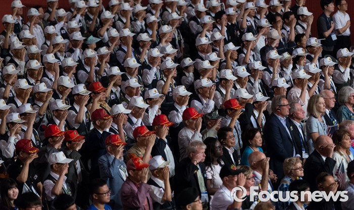 (서울=포커스뉴스) 27일 오전 서울 송파구 올림픽공원 올림픽홀에서 열린 정전협정 63주년 및 유엔군 참전의 날 기념식에서 6·25 전쟁 참전용사들이 국기에 대한 경례를 하고 있다.