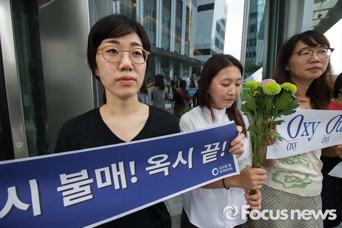 (서울=포커스뉴스) 27일 오전 서울 영등포구에 위치한 옥시레킷벤키저 본사 앞에서 가습기살균제참사전국네트워크 회원들이 '제2의 옥시를 막자-가습기살균제사고 기업 현장조사' 기자회견을 하고 있다.