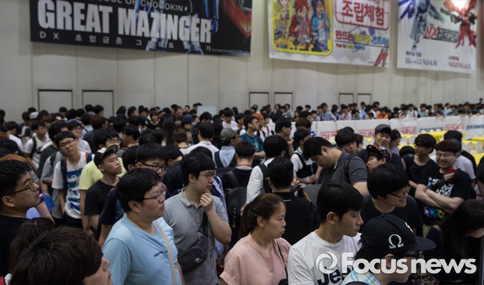(서울=포커스뉴스) 27일 오전 서울 강남구 코엑스에서 열린 '건프라 엑스포 2016'을 찾은 관람객들이 장내 매장을 향해 줄을 서고 있다.