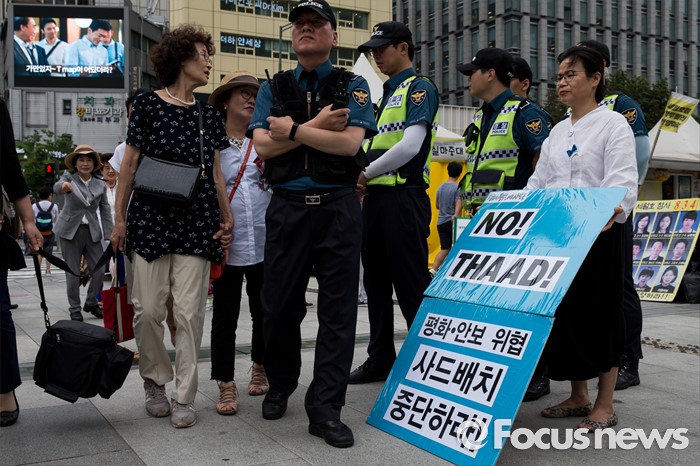 (서울=포커스뉴스) 27일 오전 서울 종로구 광화문광장에서 엄마부대, 나라지키기운동본부 등 4개 단체 회원들이 정전협정 63주년 기자회견을 마치고 사드배치 반대 피켓을 보고 있다.
