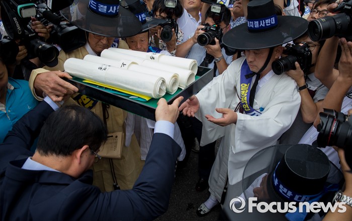 (서울=포커스뉴스) 27일 오전 서울 종로구 청운효자동 주민자치센터 앞에서 열린 '사드 배치 반대 기자회견'에 참석한 청와대 국민소통비서관이 성주 유림단체 회원들로부터 상소문을 전달받고 있다.