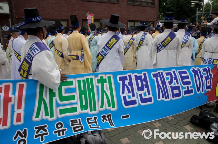 (서울=포커스뉴스) 27일 오전 서울 종로구 청운효자동 주민자치센터 앞에서 열린 '사드 배치 반대 기자회견'에 참석한 성주 유림단체 회원들이 전면 재검토를 요구하는 펼침막을 들고 있다.