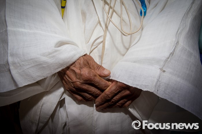 (서울=포커스뉴스) 27일 오전 서울 종로구 청운효자동 주민자치센터 앞에서 열린 '사드 배치 반대 기자회견'에 참석한 성주 유림단체 회원이 두 손을 가지런히 모으고 있다.
