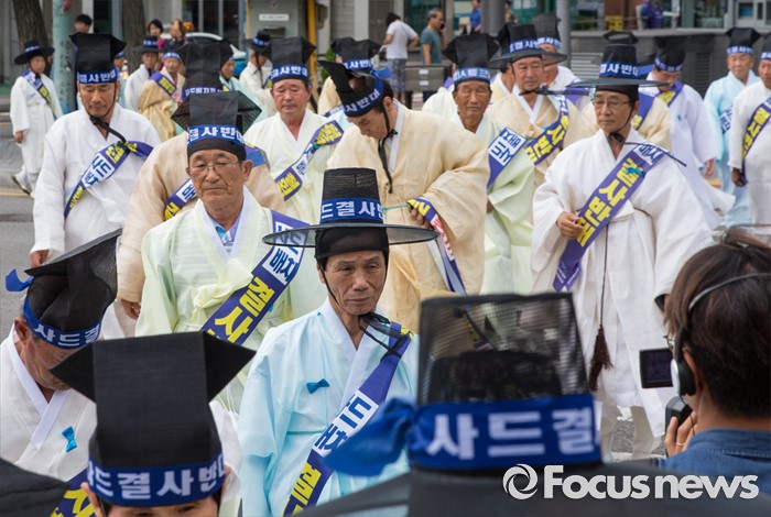 (서울=포커스뉴스) 27일 오전 서울 종로구 청운효자동 주민자치센터 앞에서 성주 유림단체 회원들이 '사드 배치 반대 기자회견'에 참석하기 위해 발걸음을 옮기고 있다.