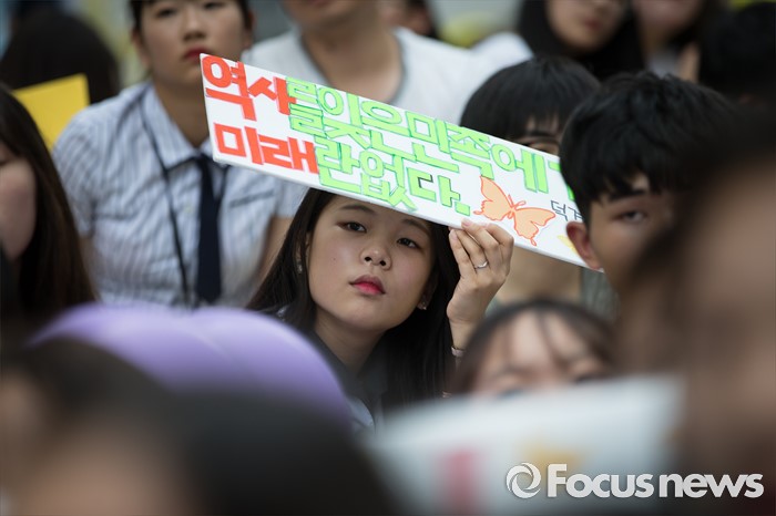 (서울=포커스뉴스) 27일 오후 서울 종로구 옛 일본대사관 앞에서 제1241차 일본군 위안부 문제해결을 위한 정기 수요집회가 열리고 있다.