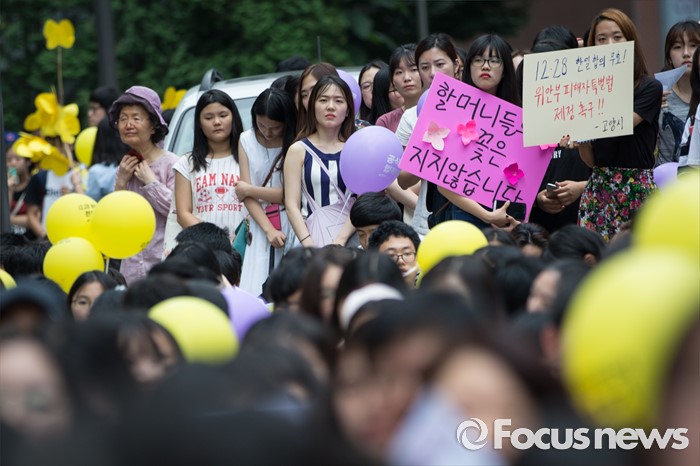 (서울=포커스뉴스) 27일 오후 서울 종로구 옛 일본대사관 앞에서 제1241차 일본군 위안부 문제해결을 위한 정기 수요집회가 열리고 있다.