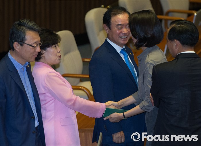 (서울=포커스뉴스) 27일 오후 서울 여의도 국회에서 열린 344회 국회(임시회) 3차 본회의에 김수민 국민의당 의원이 참석해 동료 의원들과 악수하고 있다.