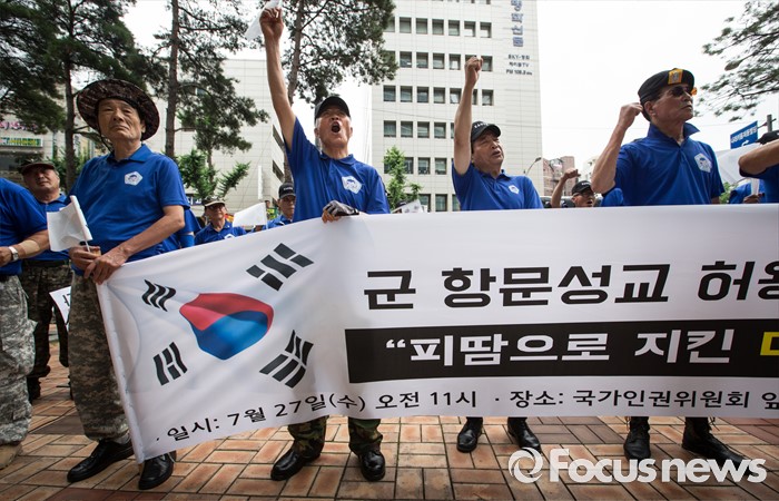 (서울=포커스뉴스) 27일 오전 서울 중구 국가인권위 앞에서 고엽제 전우회를 비롯한 보수단체가 국가인권위가 군 동성애를 조장하고 북한 인권에 무관심하다며 시위하고 있다.