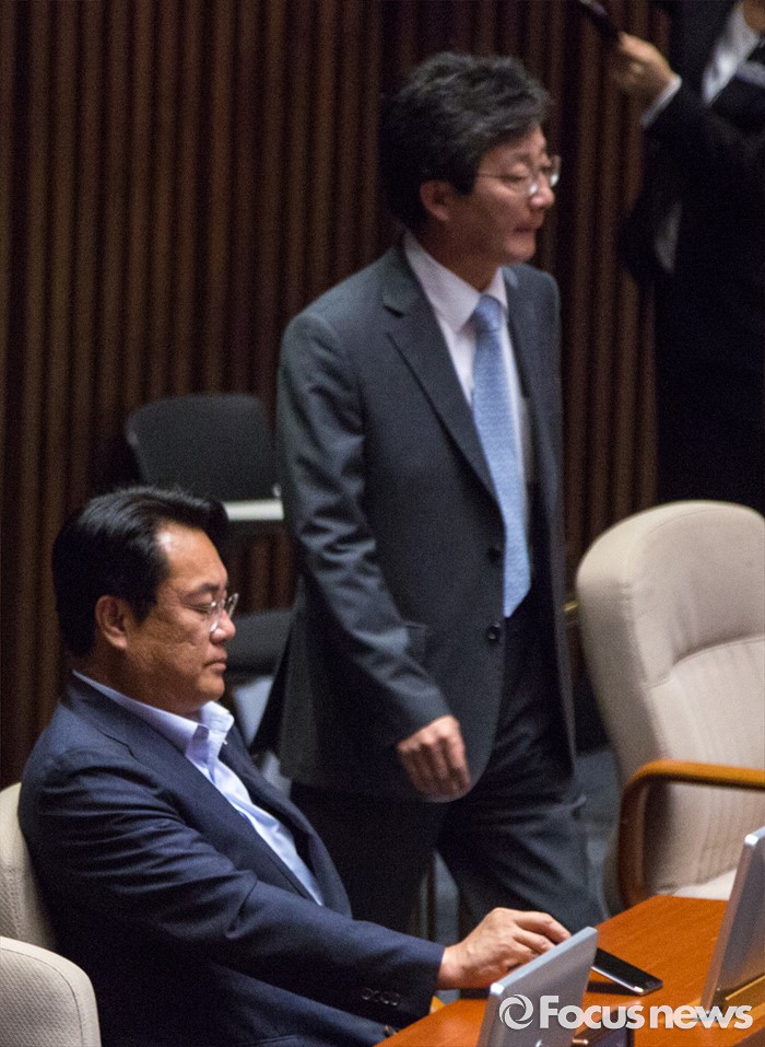 (서울=포커스뉴스) 정진석(왼쪽) 새누리당 원내대표가 27일 오후 서울 여의도 국회에서 열린 344회 국회(임시회) 3차 본회의에 참석 하고 있다. 사진 오른쪽은 유승민 새누리당 의원.