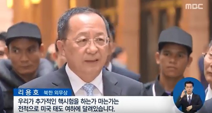 리 외무상은 "추가 핵실험은 전적으로 미국의 태도에 달려 있다. 조선반도 비핵화는 미국에 의해 하늘로 날아간 거나 같게 됐다"고 말했다.