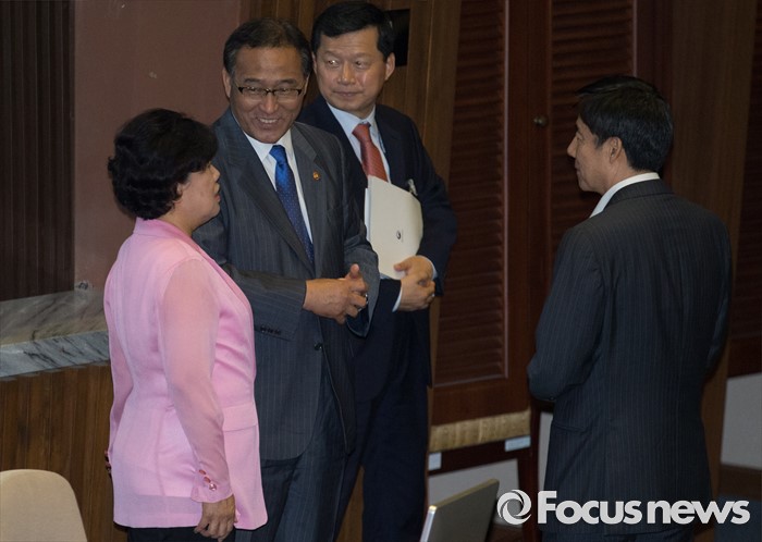 (서울=포커스뉴스) 27일 오후 서울 여의도 국회에서 열린 344회 국회(임시회) 3차 본회의에 참석한 홍윤식(왼쪽 두번째) 행정자치부 장관이 조배숙(왼쪽 첫번째), 이용훈(오른쪽) 국민의당 의원과 대화하고 있다.