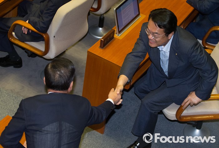 (서울=포커스뉴스) 27일 오후 서울 여의도 국회에서 열린 344회 국회(임시회) 3차 본회의에 참석한 정진석(오른쪽) 새누리당 원내대표와 서청원 의원이 인사하고 있다.