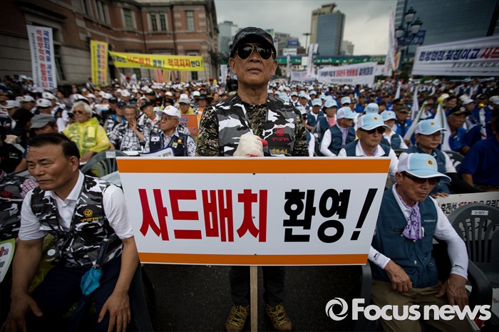 (서울=포커스뉴스) 27일 오후 서울 용산구 서울역광장에서 열린 사드배치 지지 범국민대회 및 자유민주평화통일 결의대회에 중앙보훈단체안보협의회·대한민국상이군경회 회원들이 사드 배치에 찬성하며 손 피켓을 들고 있다.