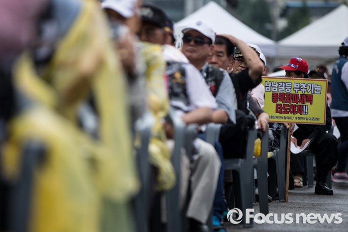 (서울=포커스뉴스) 27일 오후 서울 용산구 서울역광장에서 열린 사드배치 지지 범국민대회 및 자유민주평화통일 결의대회에 중앙보훈단체안보협의회·대한민국상이군경회 회원들이 사드 배치에 찬성하며 손 피켓을 들고 있다.