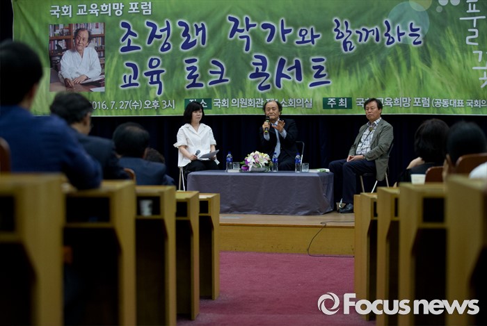 (서울=포커스뉴스) 27일 오후 서울 여의도 국회 의원회관에서 국회 교육희망포럼 주최로 열린 교육 토크 콘서트에 참석한 조정래 작가가 발언하고 있다.