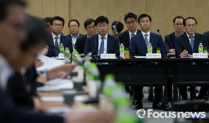 (분당=포커스뉴스) 27일 오후 경기도 성남 분당구 SK케미칼 본사에서 열린 가습기살균제 사고 진상규명과 피해구제 및 재발방지 대책마련을 위한 국정조사특별위원회 현장조사에서 김철(앞줄 오른쪽두번째) SK케미칼 대표이사가 우원식 위원장의 발언을 경청하고 있다.