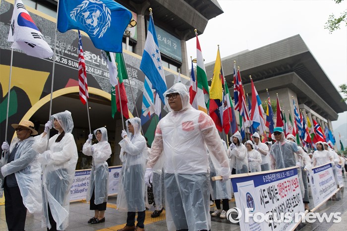 (서울=포커스뉴스) 27일 오후 서울 종로구 세종문화회관 인근에서 월드피스자유연합 관계자들이 6.25전쟁 당시 대한민국 지원 세계 67개국 국기를 들고 퍼레이드를 하고 있다.