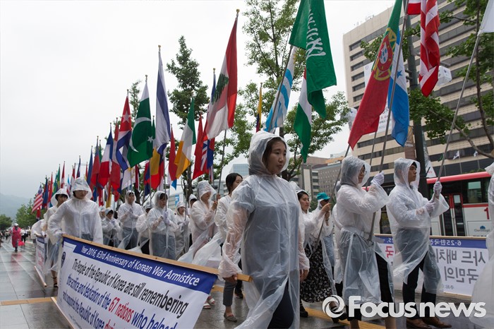 (서울=포커스뉴스) 27일 오후 서울 종로구 세종문화회관 인근에서 월드피스자유연합 관계자들이 6.25전쟁 당시 대한민국 지원 세계 67개국 국기를 들고 퍼레이드를 하고 있다.