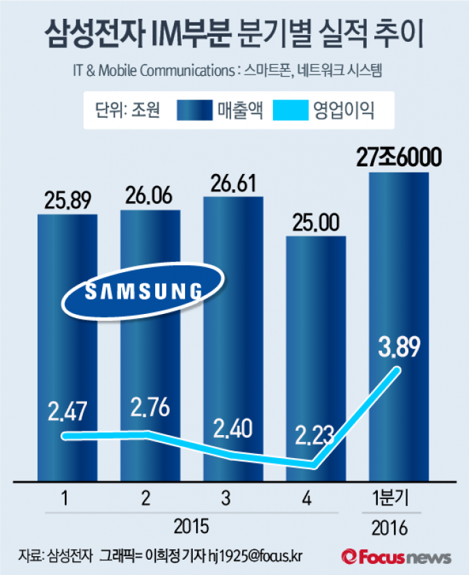(서울=포커스뉴스) 삼성전자는 지난 1분기 IM사업부문(IT & Mobile Communications)에서 27조6000억의 매출과 3조892억원의 영업이익을 기록했다.