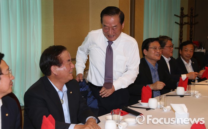 (서울=포커스뉴스) 서청원 새누리당 의원이 27일 오후 서울 영등포구 여의도 한 식당에서 열린 친박(친박근혜)계 의원 만찬회동에서 인사말을 한 뒤 웃옷을 벗고 있다.