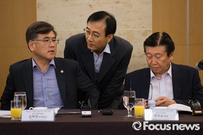 (서울=포커스뉴스) 28일 오전 서울 서초구 쉐라톤 서울 팔래스 강남 호텔에서 열린 '책임있는 소비문화 조성을 위한 기업인과의 간담회'에 참석한 김학현(왼쪽) 공정거래위원회 부위원장과 한견표(오른쪽) 한국소비자원 원장이 관계자와 대화하고 있다.