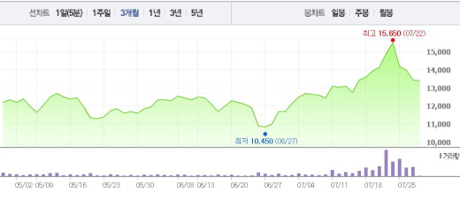 NEW는 28일 오전 9시12분 현재 전 거래일 대비 0.37%(50원) 하락한 1만3400원에 거래되고 있다. NEW는 15일부터 22일까지 1~5%의 상승폭을 기록했다.