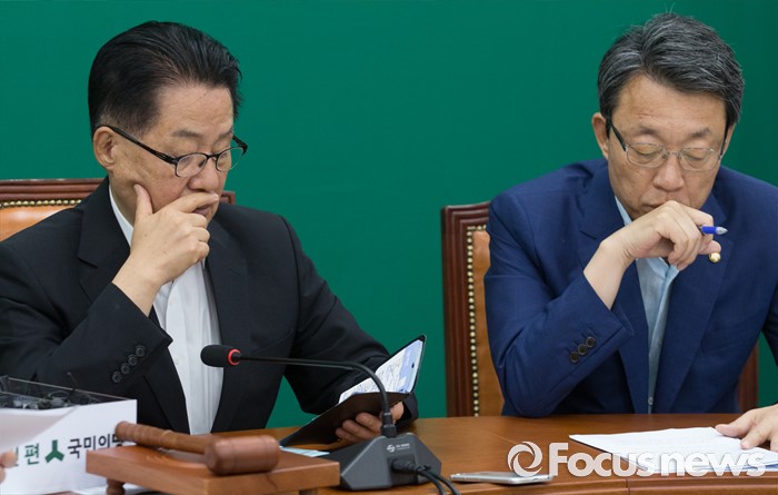 사드 배치 논란에 대해선 여론조사상 재검토 의견이 52%로 역전된 점을 들어 "이런 상황에 교육부는 전국 초중고에 국방부가 제출한 사드 홍보자료를 학생, 학부모에게 안내해달라는 공문을 내려보냈다고 한다. 정부의 일방적 주장을 담은 자료를 어린 학생에게까지 강요하는 것은 절대 교육적이지 않다"고 비판했다.서울 여의도 국회에서 열린 국민의당 원내정책회의에 참석한 박지원(왼쪽) 비상대책위원장과 김성식 정책위의장이 생각에 잠겨 있다. 2016.07.28 박동욱 기자
