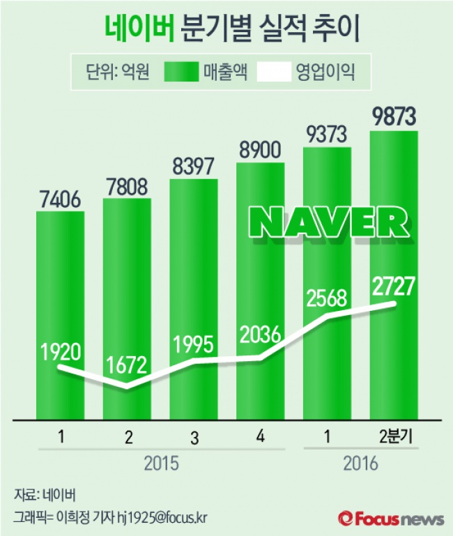 (서울=포커스뉴스) 28일 네이버는 올해 2분기 매출액 9,873억원, 영업이익은 전년동기대비 44%오른 2,727억원으로 집계됐다고 공시했다.