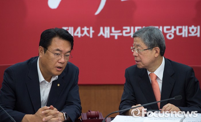 (서울=포커스뉴스) 김희옥(오른쪽) 새누리당 혁신비상대책위원장과 정진석 원내대표가 28일 오전 서울 여의도 새누리당사에서 열린 혁신비상대책위원회의에 참석해 의견을 나누고 있다.