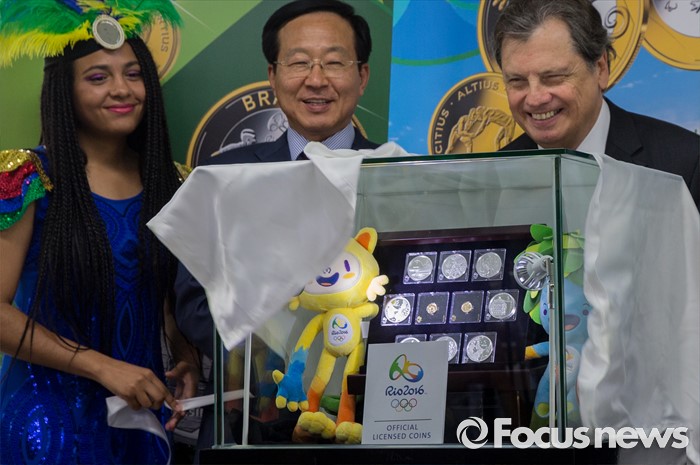 (서울=포커스뉴스) 28일 오전 서울 종로구 주한 브라질대사관에서 루이스 페르난도 세하(맨 오른쪽) 주한 브라질 대사가 '2016 리우 올림픽 기념주화'를 공개하고 있다.