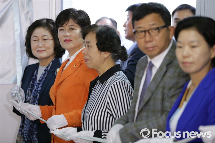 (서울=포커스뉴스) 위안부 지원 재단인 화해 ·치유재단이 공식 출범하는 28일 오전 서울 서대문구 바비엥 스위트에서 김태현(왼쪽) 이사장과 강은희(왼쪽 두 번째) 여성가족부 장관이 현판 제막식에 앞서 포즈를 취하고 있다.