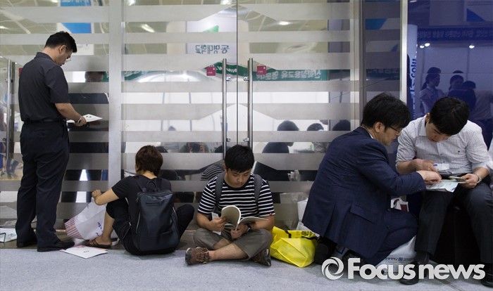 (서울=포커스뉴스) 28일 오전 서울 강남구 코엑스에서 열린 2017학년도 수시 대학입학정보박람회 행사장을 찾은 학부모와 학생들이 바닥에 앉아 대학교 홍보책자를 보고 있다. 이번 박람회는 7월 28일부터 31일까지 나흘간 진행되며 전국 140개 4년제 대학이 참가한다.