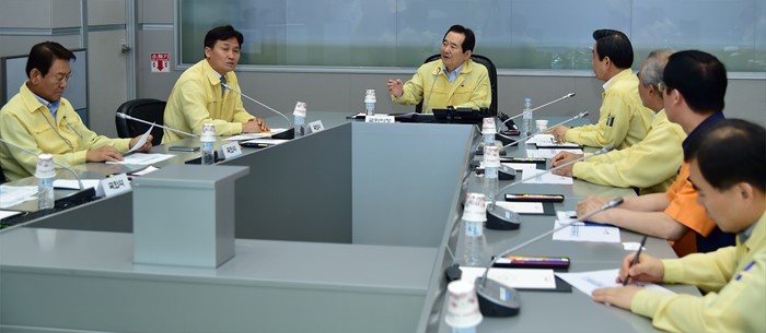 (서울=포커스뉴스) 정세균 국회의장이 28일 오전 정부서울청사 국민안전처 중앙재난안전상황실을 방문해 박인용 국민안전처 장관 등 관계자로부터 여름철 안전대책 보고를 받고 있다. <사진제공=국회>