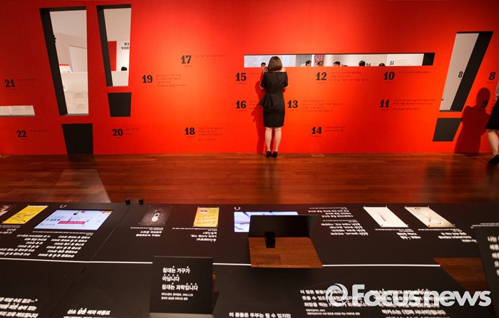 (서울=포커스뉴스) 28일 오후 서울 용산구 국립한글박물관에서 열린 기획특별전 '광고 언어의 힘' 언론 간담회에서 참석자들이 다양한 광고를 살펴보고 있다. 개화기부터 현재까지 광고의 130여년 역사를 우리말과 우리글의 관점에서 풀어낸 이 기획특별전은 7월 28일부터 11월 27일까지 열린다.