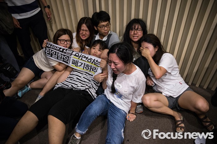 (서울=포커스뉴스) '화해·치유 재단'이 공식 출범한 28일 오전 서울 중구에 위치한 한 건물에서 열린 재단 출범 이사장 기자간담회장에서 재단 출범에 반대하는 대학생들이 회견장을 점거, 농성을 벌이고 있다.