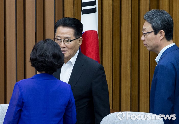 (서울=포커스뉴스) 28일 오후 서울 여의도 국회에서 열린 국민의당 비공개 의원총회에 참석한 박지원(가운데) 비상대책위원장과 김성식(오른쪽) 정책위의장, 조배숙 의원이 대화하고 있다. 검찰은 이날 김수민, 박선숙, 박준영 의원에 대한 영장 재청구를 신청했다.