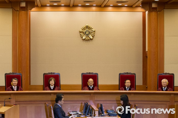 (서울=포커스뉴스) 박한철(가운데) 헌법재판소장과 법관들이 김영란법 위헌 여부 판결을 위해 28일 오후 서울 종로구 헌법재판소 대심판정에 착석해 있다.