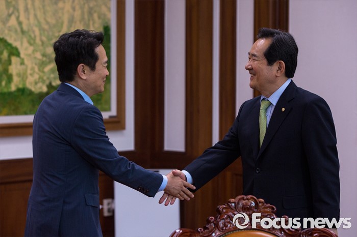 (서울=포커스뉴스) 정세균(오른쪽) 국회의장과 남경필 경기도지사가 28일 오후 서울 여의도 국회 의장접견실에서 회동에 앞서 악수 하고 있다.